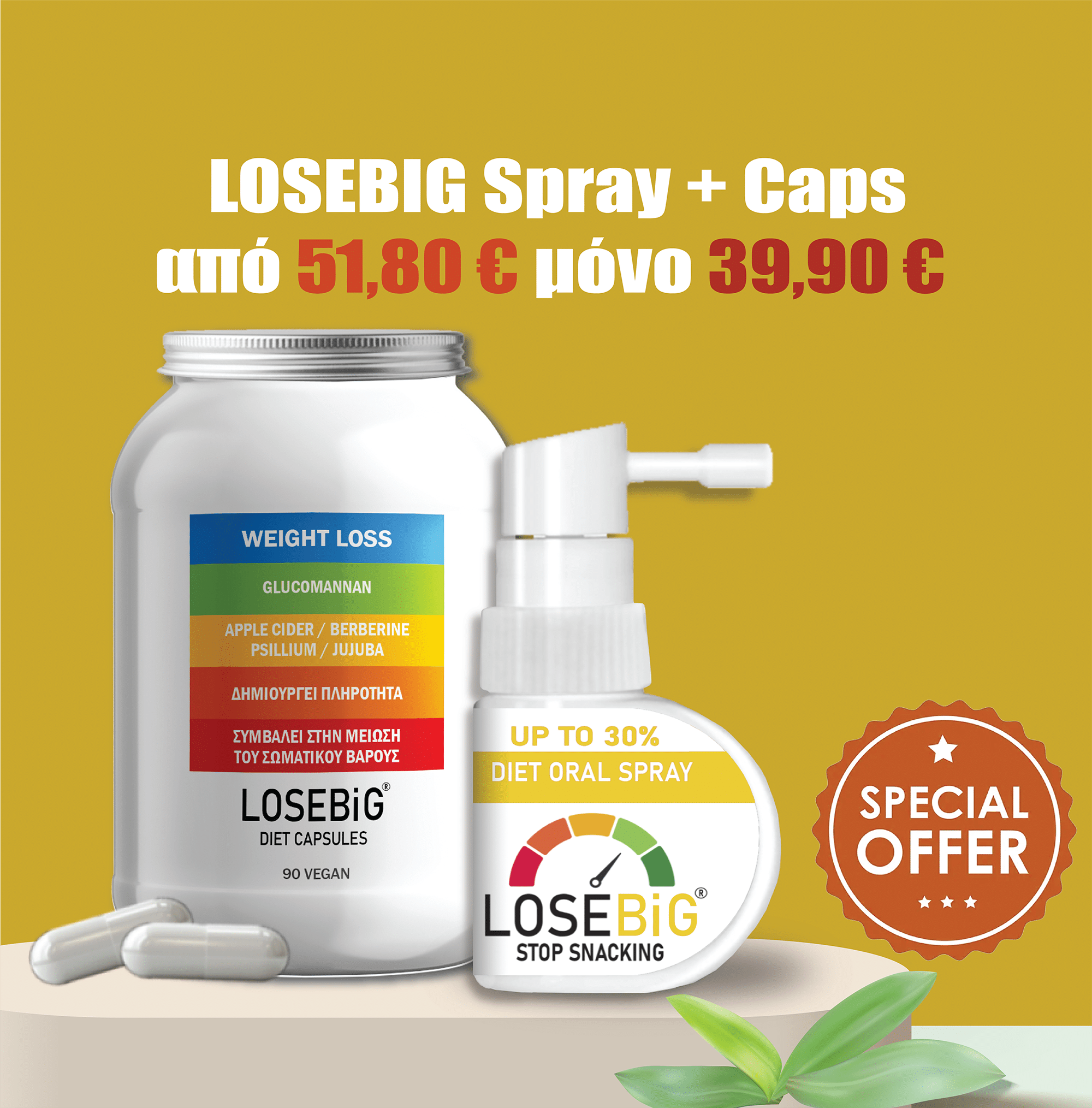 Ενώ το Spay μειώνει την λιγούρα, την συναισθηματική βουλιμία αλλά και την επιθυμία για τσιμπολόγημα σε junk snacks που ευθύνεται για το 50% των παραπανίσιων θερμίδων που λαμβάνει ο οργανισμός, ανάμεσα των γευμάτων, χωρίς να τις χρειάζεται με συνέπεια το υπερβολικό βάρος, το Losebig Caps με την μοναδική του σύνθεση έρχεται να καλύψει την υπερφαγία σε ποσότητες κατά την διάρκεια των γευμάτων και να σας καλύψει στο άλλο 50% των υπερβαλλόντων θερμίδων.