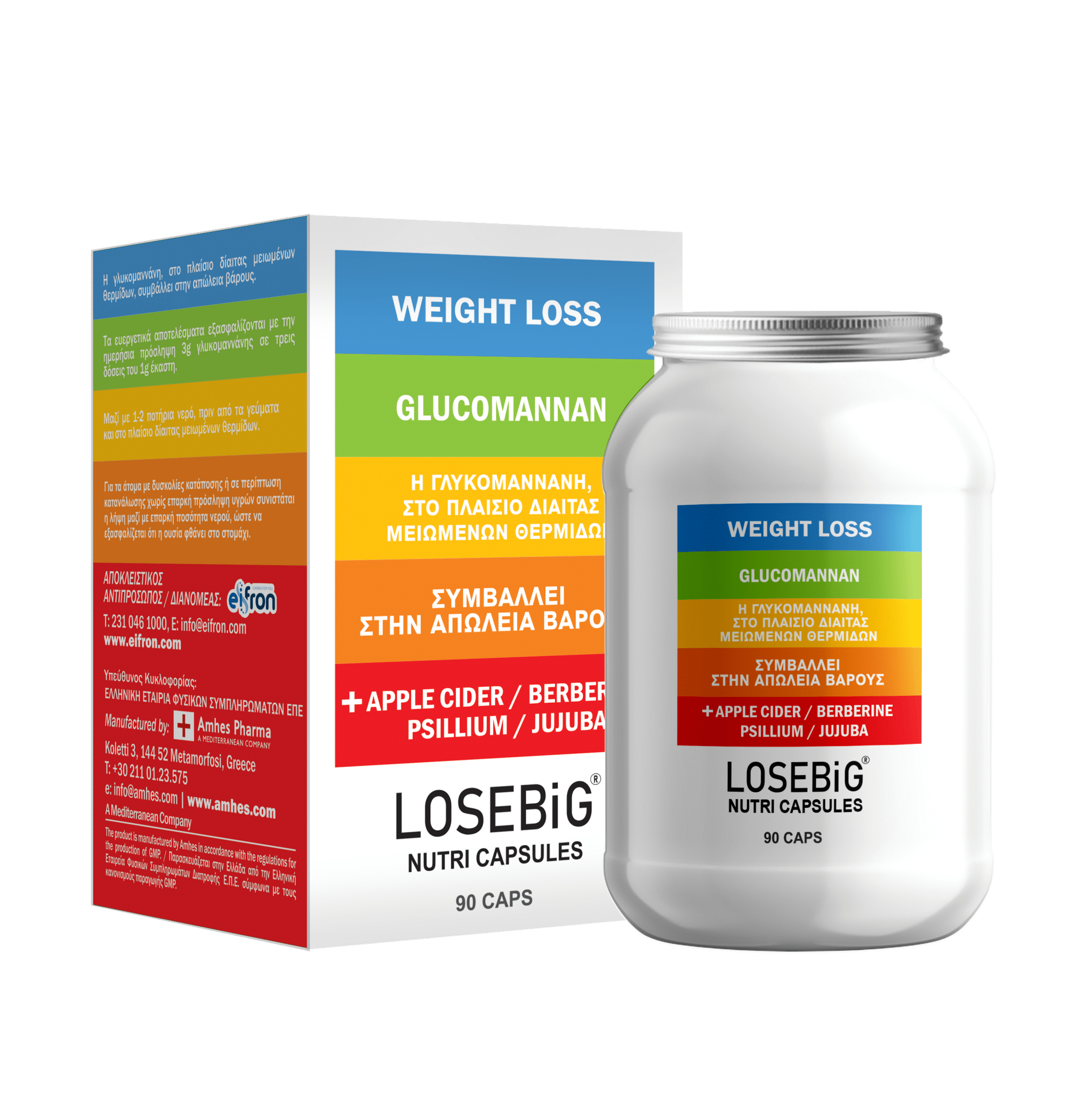 Το Losebig Caps περιέχει εγκεκριμένα συστατικά όπως η Berberine (βερβερίνη), το Psillium (ψίλιο), το Jujuba (τζίτζιφο), το Apple Cider(μηλόξυδο) και την Glucomannan (γλυκομαννάνη) η οποία σύμφωνα με την επίσημη οδηγία του EFSA λαμβάνοντας δύο κάψουλες πριν από το γεύμα με 1000mg συμβάλλει στην μείωση του σωματικού βάρους.