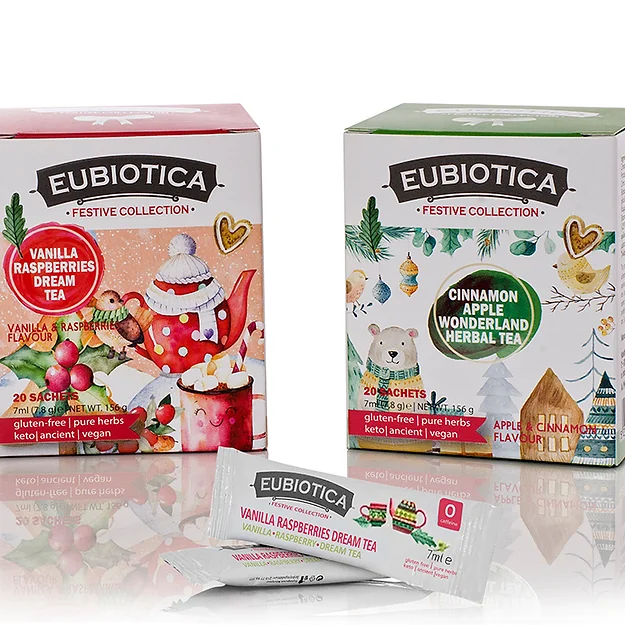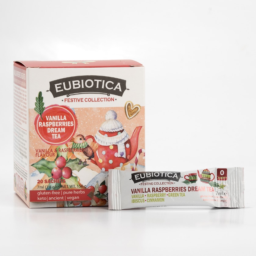 Αυτό το ονειρικό μείγμα αιχμαλωτίζει τη γλυκιά γεύση και το πλούσιο χρώμα των Blueberries & Raspberries. Περιέχει επίσης φυσικά βοτανικά συστατικά όπως πράσινο τσάι και ιβίσκο, καθώς και κανέλα και μια νότα βανίλιας. Στην EUBIOTICA πιστεύουμε στον συνδυασμό γεύσης και ευεξίας. Γι’ αυτό εξισορροπούμε προσεκτικά τα θρεπτικά συστατικά με τα αρωματικά βότανα που παραδοσιακά χρησιμοποιούνται για να υποστηρίξουν την καλή λειτουργία του οργανισμού. Η αποστολή μας είναι να δημιουργούμε τσάγια και ροφήματα για την σωματική και πνευματική ευεξία μέσα από γευστικές προτάσεις αγνών βοτάνων.
