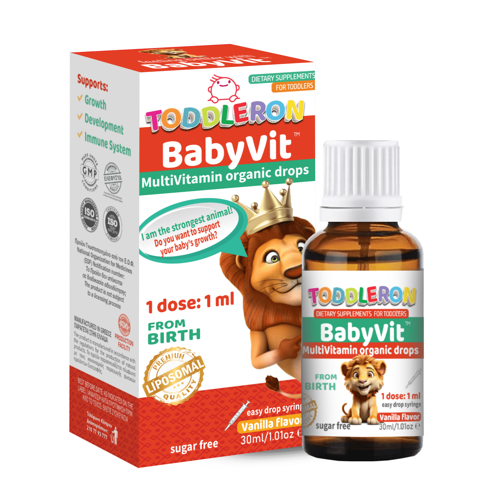 Το BabyVit 30ml είναι η πρώτη υγρή πολυβιταμίνη που έχει σχεδιαστεί αποκλειστικά για νήπια, προσφέροντας πλήρη υποστήριξη στην υγιή ανάπτυξη και την ενίσχυση του ανοσοποιητικού. Η φόρμουλά του περιέχει βασικές βιταμίνες και μέταλλα όπως C, D3, E, φολικό οξύ, Β1, Β2, Β6, Β12, ψευδάργυρο, ωμέγα-3 λιπαρά οξέα, καθώς και υπερτροφές όπως σαμπούκο και ιπποφαές.