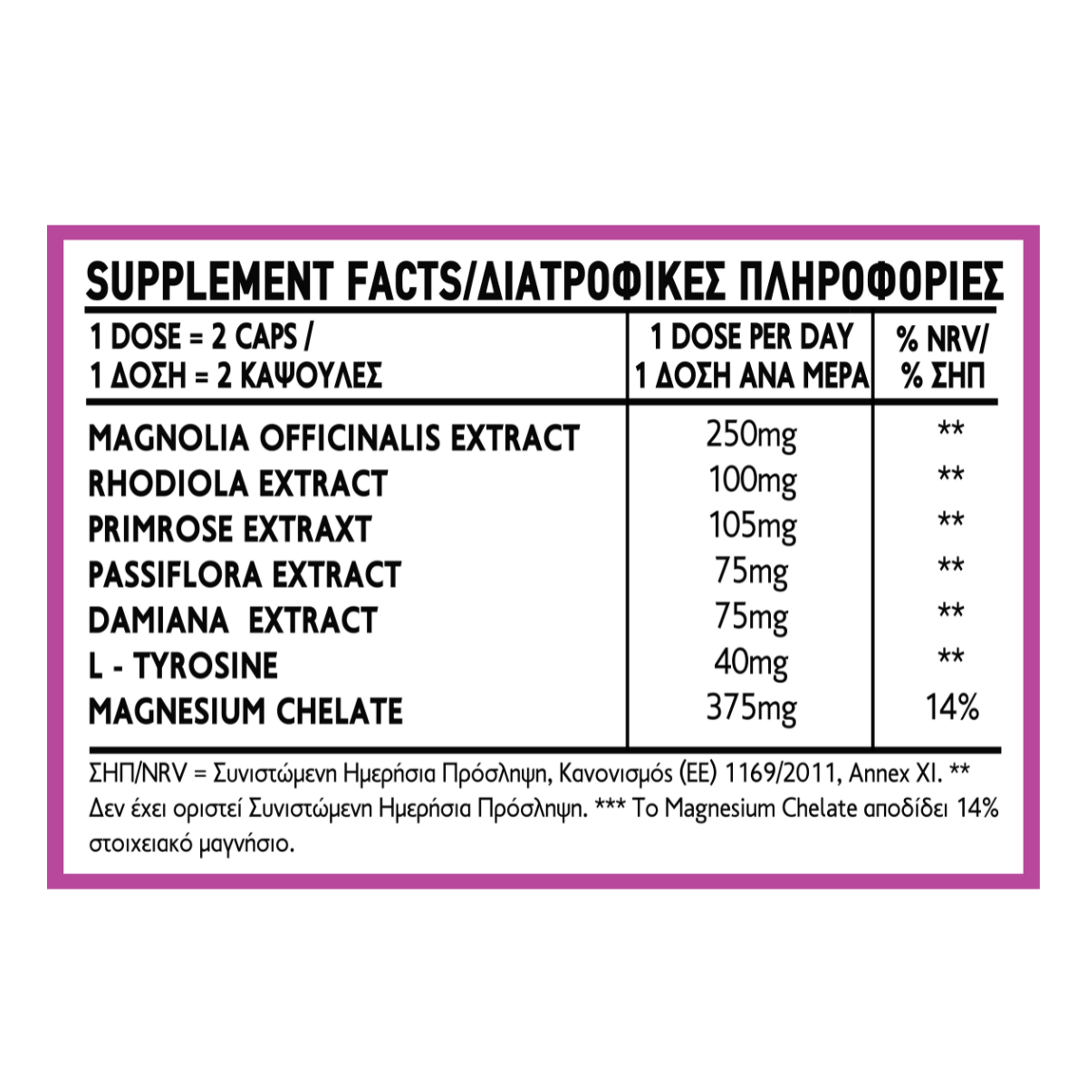 | Magnolia officinalis | Μείωση άγχους, ευερεθιστότητας, βελτίωση ύπνου | Μείωση εξάψεων και συναισθηματικής ευαισθησίας | Διατήρηση ηρεμίας, πρόληψη συναισθηματικής κόπωσης |