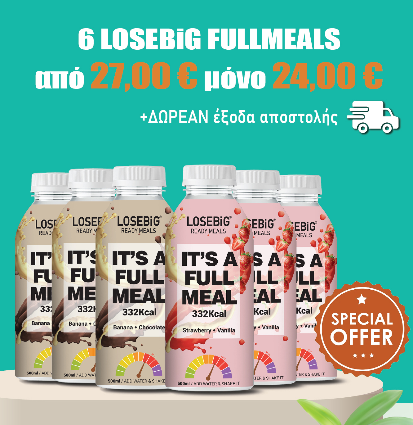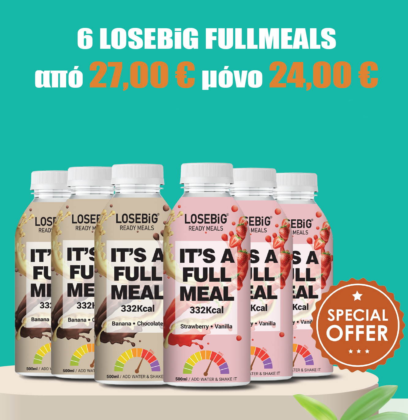 Mε σχεδόν μηδενικό λίπος, με ελάχιστα φυσικά σάκχαρα, χωρίς προσθήκη ζάχαρης, χωρίς πολλούς υδατάνθρακες, με εδώδιμες ίνες. Το FULLMEAL της LOSEBIG είναι μια σύγχρονη διατροφή που ταιριάζει απόλυτα στον γρήγορο τρόπο ζωής σας, νόστιμη, απλή και ισορροπημένη.