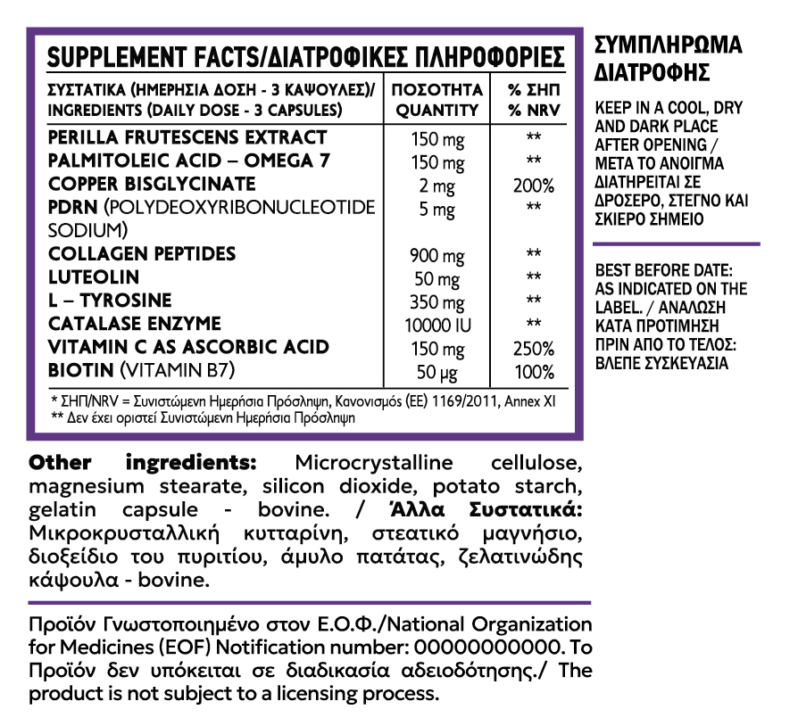 | Πεπτίδια κολλαγόνου | 900 mg | Υδρολυμένα πεπτίδια | Ενίσχυση θήλακα, ελαστικότητα δέρματος |